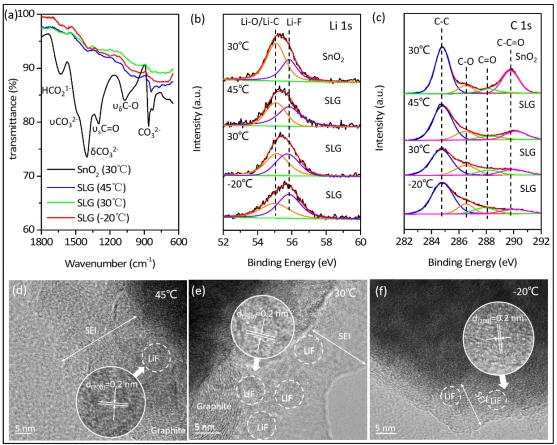 图1. (a-c) 不同温度下循环后SnO2、SLG电极的FTIR光谱、Li 1s和C 1s能谱;(d-f) 45、30和-20℃循环后SLG电极的HRTEM图像。