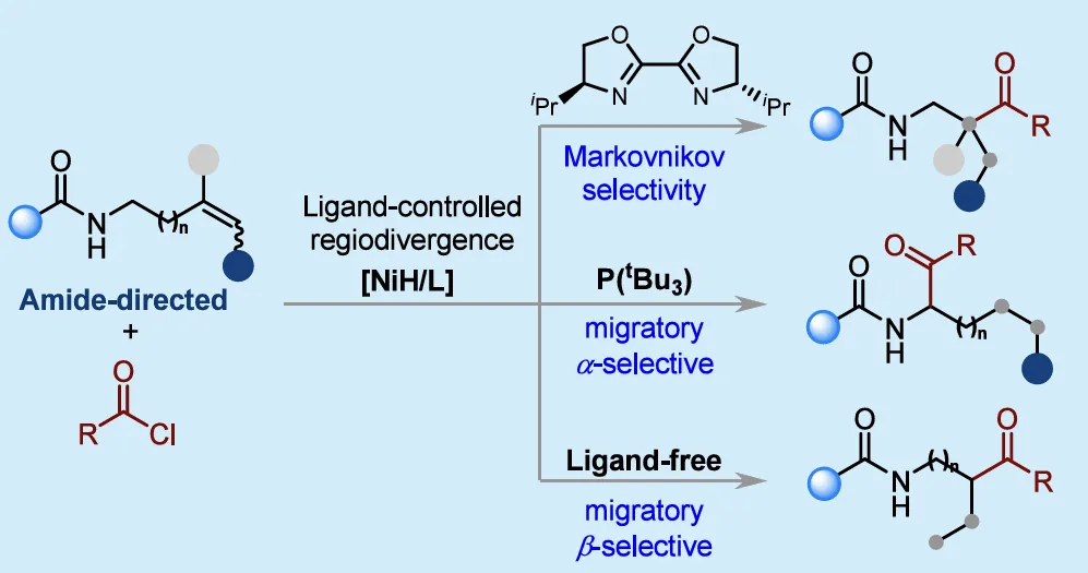 该论文是国家自然科学基金、湖南省教育厅基金等资助的重要成果之一,由李文艺教授和王超教授共同指导完成。tyc33455cc太阳集团为第一署名单位,冯浙泰为论文共同第一作者。论文研究结果表明:我们开发了一种由配体控制、酰胺导向的镍催化反应体系,可实现未活化烯烃与易得酰氯的氢酰化反应,从而能够通过区域发散性合成获得结构多样的支链酮类化合物。通过合理的配体调控,该策略既可保持马氏选择性(Markovnikov selectivity),又能实现迁移型α/β选择性。该反应在温和条件下进行,具有广泛的底物适用范围,且能兼容多种官能团。我们预计,这一高效稳定且具有模块化特点的实验方案将在合成有机化学领域得到广泛应用,尤其可用于高效制备含酮类骨架的化合物,为药物研发提供支持。