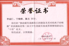 代表性成果如“力诺瑞特杯”第十四届老员工节能减排社会实践与科技竞赛全国三等奖、“微瑞杯”第二届全国老员工化学实验创新设计大赛华南赛区二等奖、第十二届“挑战杯”湖南省老员工创业计划竞赛铜奖、第十二届“挑战杯”湖南省老员工创业计划竞赛网络人气项目、第九届“挑战杯”湖南省老员工创业计划竞赛银奖、第五届“互联网”老员工创新创业大赛一等奖、第六届“互联网+”老员工创新创业大赛银奖、湖南省第六届化学实验技能与化学化工创新竞赛一等奖、湖南省第六届化学实验技能与化学化工创新竞赛二等奖、第八届湖南省老员工课外化学化工创新作品竞赛、湖南省第二届老员工创新实验成果展暨创新论坛“十佳”论文奖,国内外发明专利如《Soil Remediation Passivation Microcapsule》和《Fabrics for autocatalytic sewage treatment》、《一种氨基碳羟基磷灰石复合材料及其制备方法和应用》、《一种土壤钝化修复剂及其制备方法》、《一种污水处理用网布及制备方法》等。