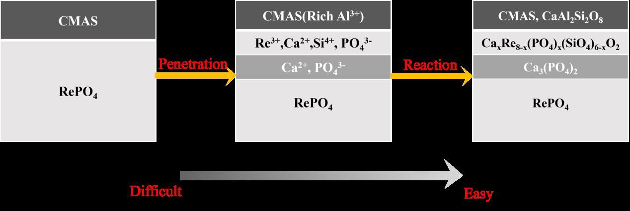 该论文是国家自然科学基金、湖南省教育厅基金等资助的重要成果之一,由孙俊彬副教授和许志锋教授共同指导完成。tyc33455cc太阳集团为第一署名单位,李利珍为论文第一作者。论文研究结果表明:多组分稀土磷酸盐材料在1250℃和1350℃下经CMAS腐蚀5 h,10 h和20 h后的主要腐蚀产物为磷灰石(Ca2+xRe8-x(PO4)x(SiO4)6-xO2)和Ca3(PO4)2,由Ca3(PO4)2组成的P-Ca层可阻止熔融CMAS的进一步渗透。与其他稀土离子相比,La3+更难与CMAS形成磷灰石。因此,降低La元素含量和稀土离子半径差有望成为提高多组分稀土磷酸盐材料抗CMAS性能的新途径。