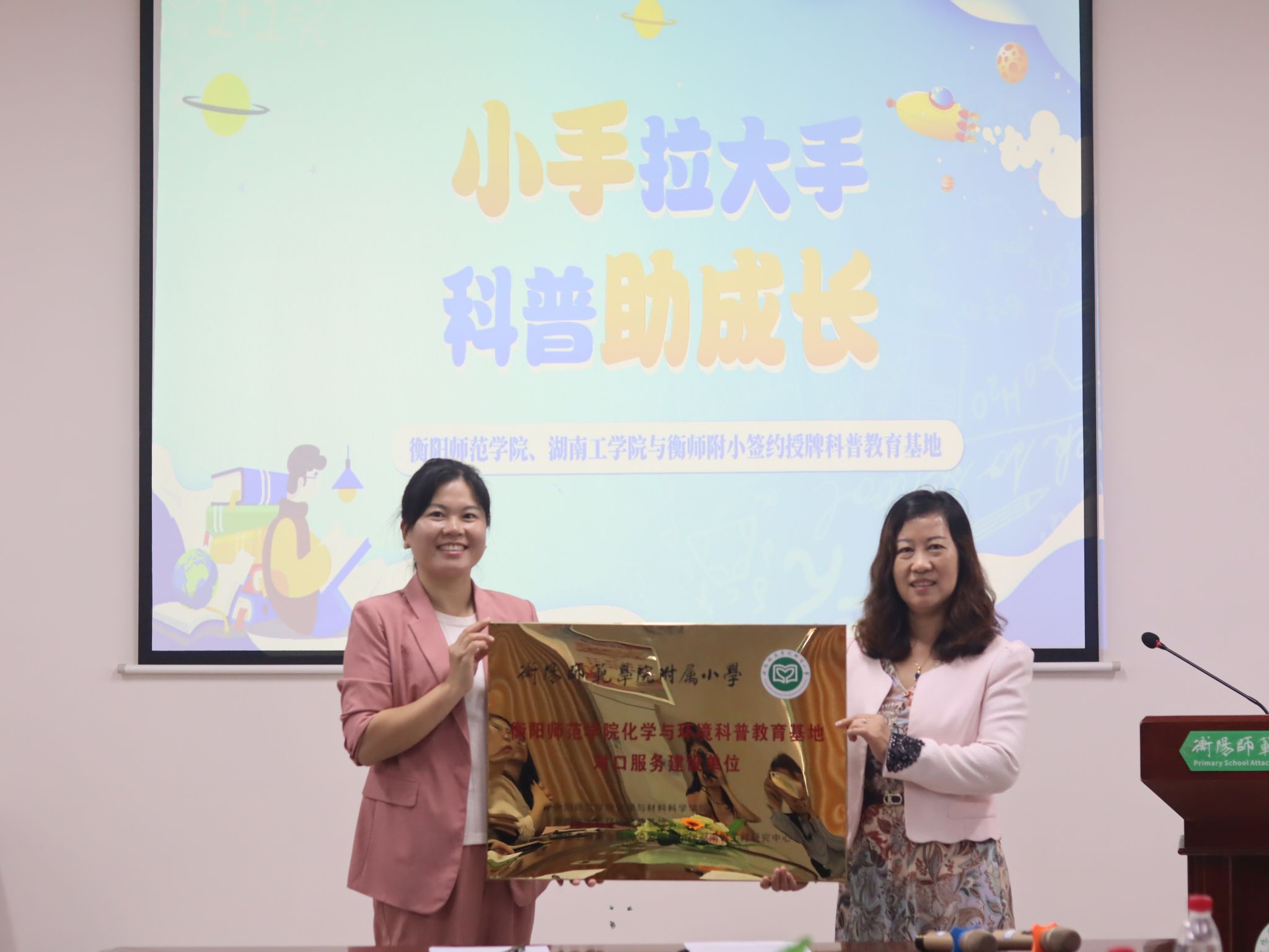 11月4日,tyc33455cc太阳集团与tyc33455cc太阳集团附属小学举行“化学与环境科普教育基地”签约授牌仪式。化学与材料科学公司党总支书记刘梦琴、副书记阳曼、副经理付伟伟以及衡师附小党总支书记、董事长邹利民、副董事长韩艳玲、罗灿、彭伟家等全体中层干部出席挂牌仪式。活动由附小副董事长韩艳玲主持。