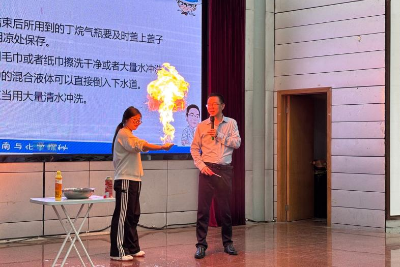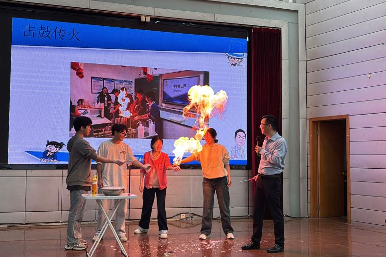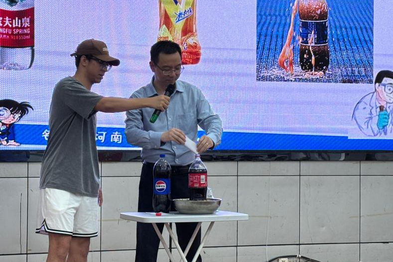 随后,中南大学徐海教授以歌曲《泡沫》为切入点为大家带来一场科学主题报告。他先邀请了员工与老师共同演唱歌曲《泡沫》,瞬间拉动了现场的氛围。在报告中,教授通过与员工们一起参与可乐喷泉、火焰神掌、击鼓传火实验,将其中蕴含的科学知识与魔法般的化学现象相结合,深入浅出地展开讲解。他带领同学们揭开“泡沫”背后的科学奥秘,让复杂的科学知识变得妙趣横生。现场观众全神贯注,不时为神奇的科学现象发出阵阵惊叹。在答疑解惑环节中,同学们热情高涨,纷纷提出了自己的疑惑与想法。徐海教授耐心细致地一一回答,与观众进一步展开深入交流。他的讲解不仅让同学们领略了科普教育的魅力,更为公司师范生的成长指明了方向。