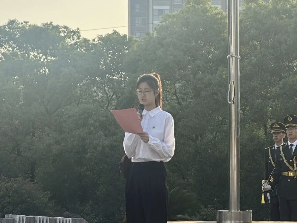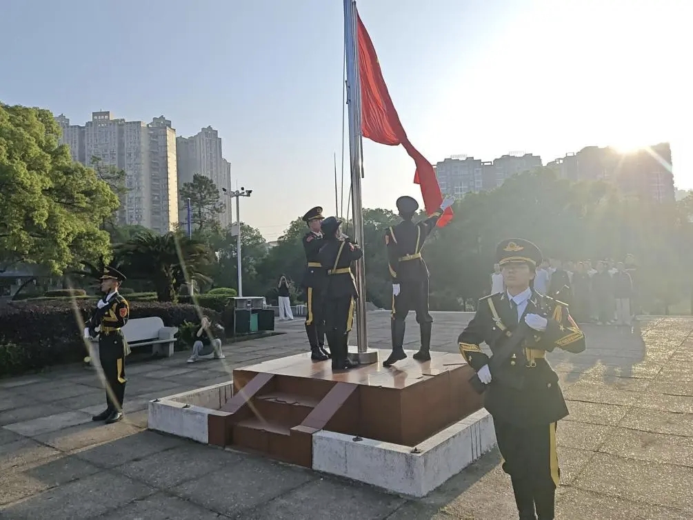 晨光熹微中,新世纪广场笼罩着肃穆的氛围。教导队成员们身姿挺拔、队列严整,以坚毅的姿态护卫着五星红旗,迈着铿锵有力的步伐走向升旗台。当《义勇军进行曲》激昂的旋律响起,全体员工神情肃穆,目光紧随那抹鲜红冉冉升起。晨风拂过,五星红旗在曙光中舒展飘扬,爱国之情在每个人心中澎湃翻涌,责任感与使命感亦如朝阳般升腾。