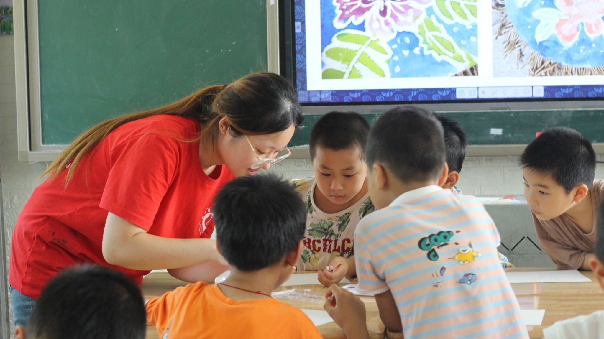 “请大家拿起手中纸杯,用剪刀把它剪成相同大小的四份。”志愿者耐心地向二年级孩子们讲解利用一次性纸杯制作小风车的步骤,孩子们目不转睛地盯着志愿者,按照“剪四瓣”“折叶片”“画图案”“穿棉签”“沾黏土”这五个步骤进行操作,直到做完一个个小风车。“老师,你看,我的风车做得最好!”一个小朋友举着手中的小风车,向志愿者开心地展示。其他年级的教室里,志愿者利用纸和快递纸盒,一边带领孩子们制作了水果团扇、纸盒小狗,一边向孩子们讲述“资源循环利用”对环境保护的意义。此外,在四、五年级的教室里也非常热闹,孩子们用蜡笔和水彩,在素描纸上就能画出一幅漂亮的简笔蜡染,一张张普通的纸,经过孩子们的勾勒、晕染创作出一幅幅充满童真的画作。