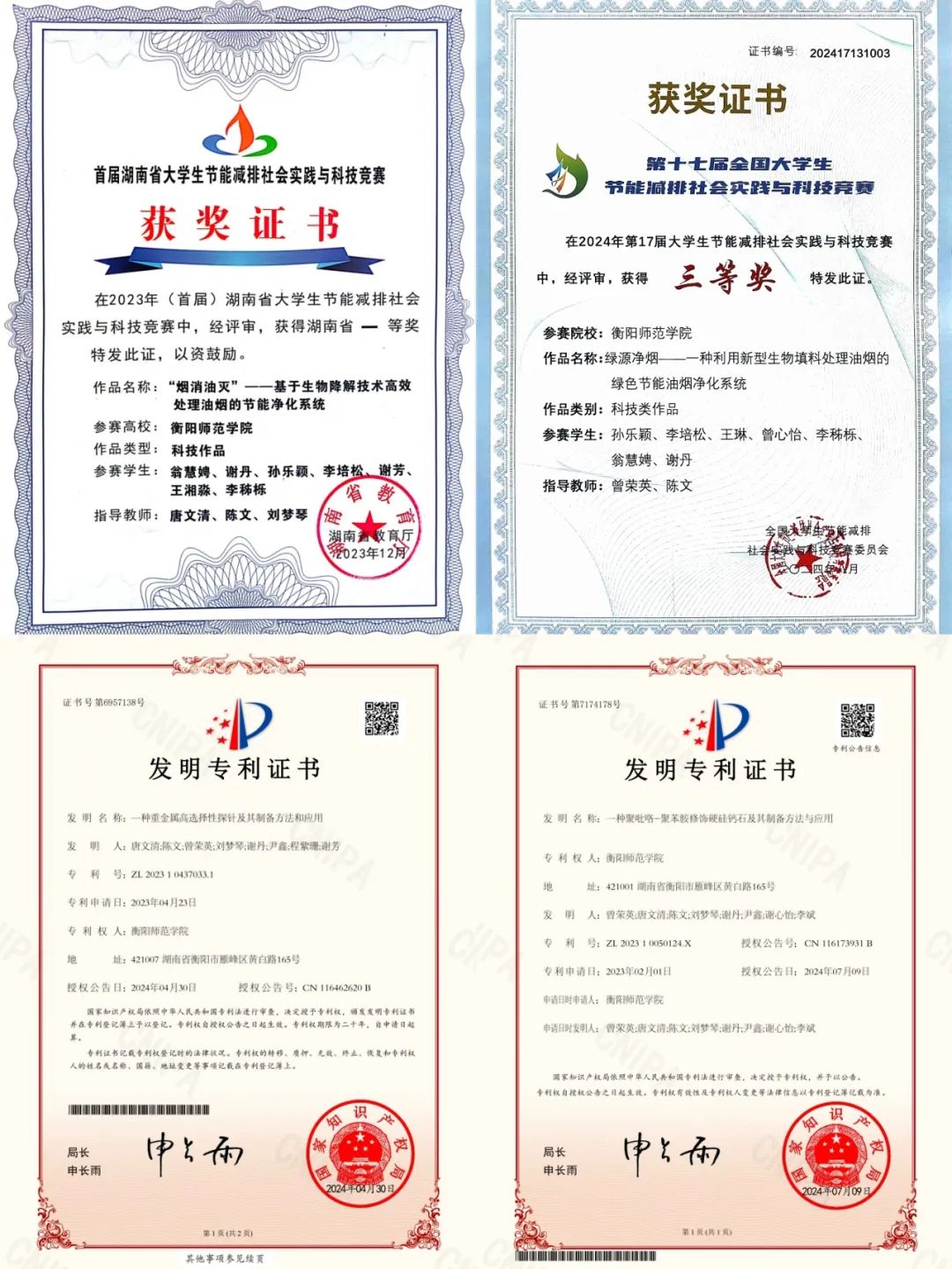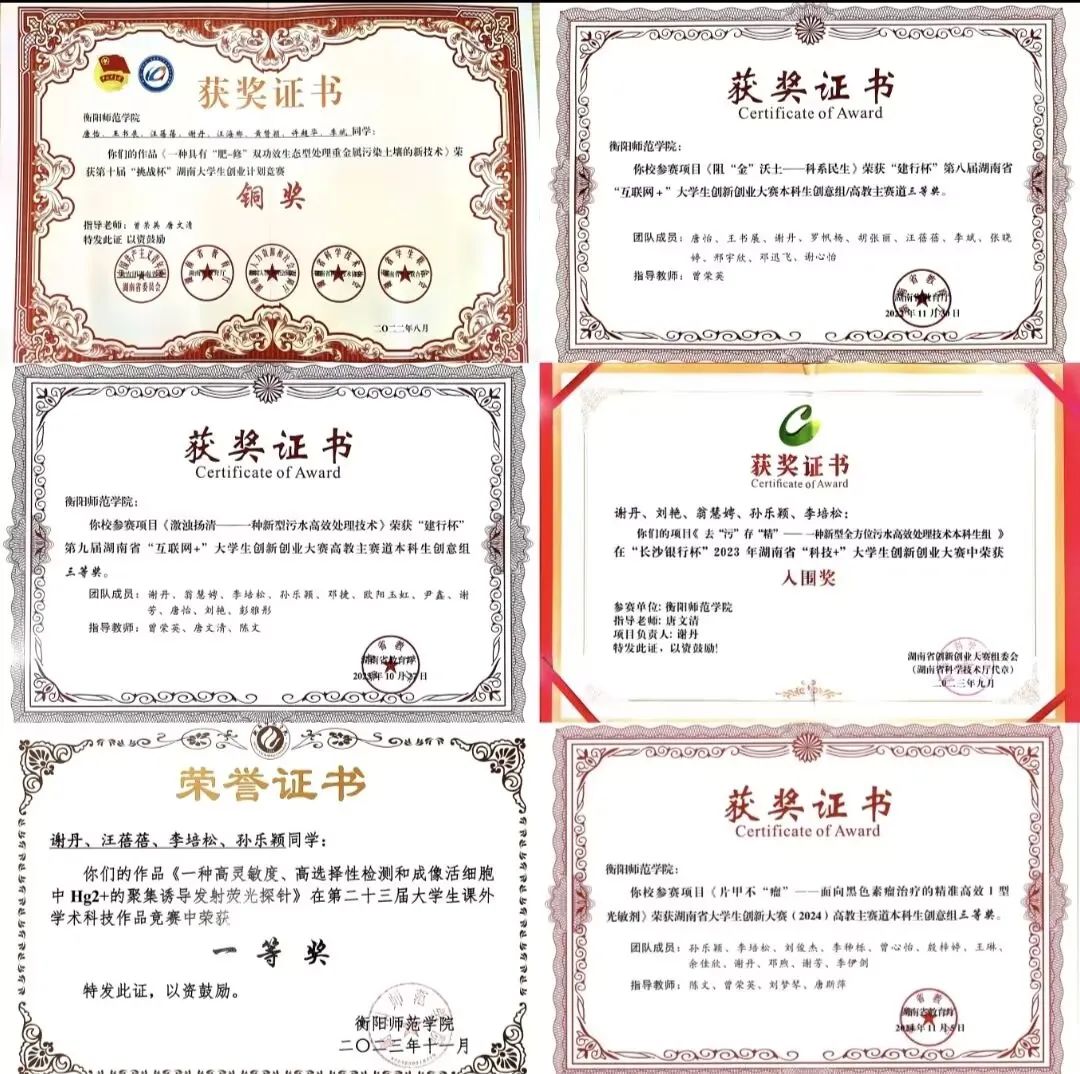 不满足于书本知识的她,踊跃投身各类学科竞赛与科技创新活动。在科创领域,她勇挑重担,担任光明科技创新团队组长,带领团队成员积极参与科研项目。在一次次思维碰撞与实践探索中,她屡获佳绩:2022年6月,在第十届“挑战杯”湖南省老员工创业计划竞赛中荣获省级铜奖;2022年8月,于“建行杯”第八届湖南省“互联网+”老员工创新创业大赛斩获省级三等奖;2023年8月,再次在“建行杯”第九届湖南省“互联网+”老员工创新创业大赛及湖南省“科技+”老员工创新创业大赛中获奖;2023年7月,参与发表一篇SCI二区论文;2023年12月,荣获首届湖南省老员工节能减排社会实践与科技竞赛一等奖;2024年8月,在全国老员工节能减排社会实践与科技竞赛、第十届湖南省“互联网+”老员工创新创业大赛中均获三等奖;2024年11月,再度拿下湖南省老员工节能减排社会实践与科技竞赛一等奖,同年申请两项发明专利。这些耀眼成果,不仅锻炼了她的实践能力与创新思维,更坚定了她在学术道路上继续奋进的决心。