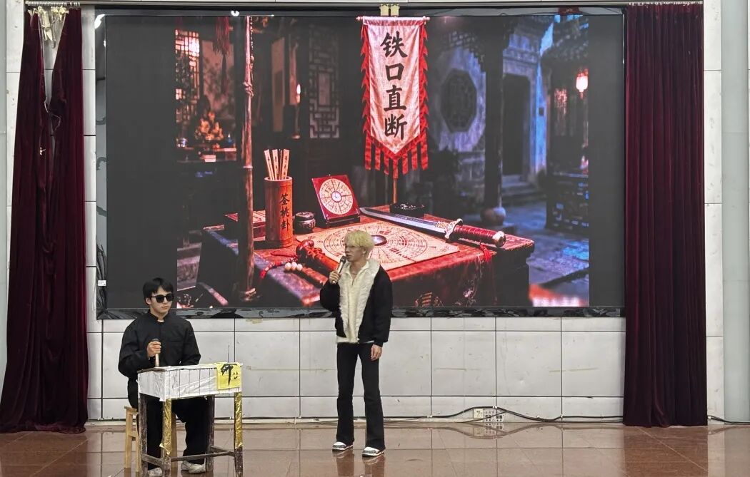 本次决赛由个人赛和团体赛组成。首先进行的是个人赛,晏晨同学从中国名著《红楼梦》中深入,以王熙凤的视角讲述了她“盛极而衰”的人生经历,优美的舞姿和饱含情感的话语赢得了老师评委和同学们热烈的掌声;尹雅菲同学带来的《普法直播间》面向全体成员,强化互动共情,增强法律意识,获得了在场人员的一致好评;宁岐峰带来《算命风云》,演绎趣味算命相关的精彩内容;陈雁深情演唱《明天你好》,用歌声传递对未来的美好期许;郭瑶结合演讲与舞蹈带来《山河无恙,如愿盛世》,展现家国情怀与盛世景象;曹景程表演《明天》,诠释对明天的憧憬与感悟;周晓慧带来《新闻联播·奇闻聚焦》,以新闻联播形式播报趣味奇闻;刘俊晞讲述《大一新生的烦恼》,分享新生入学后的困惑与趣事;李美瑶进行《浪浪山小妖怪》解说,趣味解读动画中的小妖怪故事;蒋新华带来《新闻瞎播》,以幽默调侃的方式演绎“另类新闻”。他们的精彩表演赢得了全体热烈掌声。