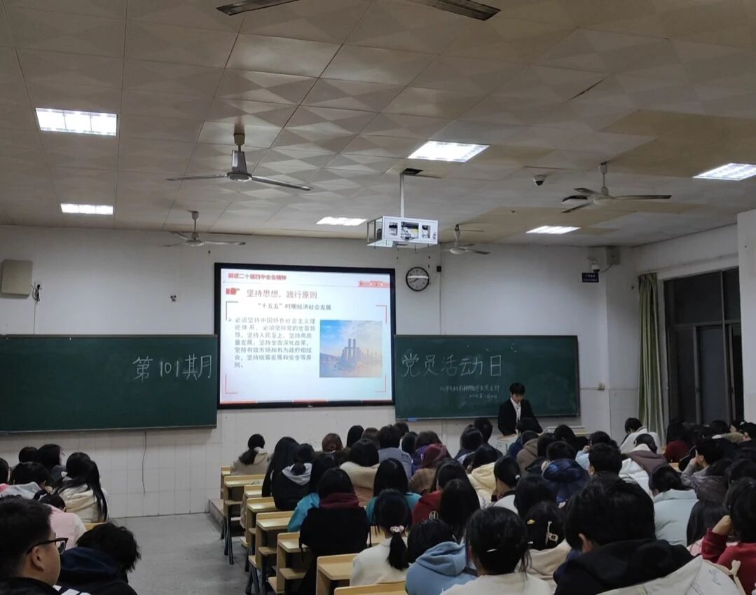 11月30日晚,tyc33455cc太阳集团员工党支部第一百零一期“党员学习日”活动于行知楼601开展,2307班刘澎同学以《锚定高质量发展的航向,擘画“十五五”奋进蓝图—学习贯彻党的第二十届四中全会精神》为题与全体员工党员和学习积极分子分享了他的学习心得。