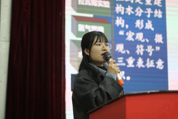 片段教学以及说课环节在师范生技能大赛中举足轻重,为此,公司特邀了2020届优秀员工、衡阳市成章实验中学的李娟老师上了一堂《水的组成》片段教学和说课的示范课。李娟老师此前曾在湖南省实验教学说课竞赛和实验操作教学竞赛中荣获一等奖和二等奖的好成绩,她用巧妙的教学设计,简练流畅的语言,环环相扣、条理清晰地为同学们呈现了一堂精彩的示范课,赢得了现场观众热烈的掌声。随后,20级化学4班的尹琳琴同学作为今年全国师范生技能大赛参赛选手,分享了自己参赛的经验,并为大家带来了《铁盐和亚铁盐——探秘铁肥的变质》的片段教学展示。潘蕊同学在听完他们的课堂展示后说道:“李老师的课堂展示让我们师范生深受启发,让我们清晰地认识到了一位优秀的老师应该具备怎样基本素养和专业能力。”