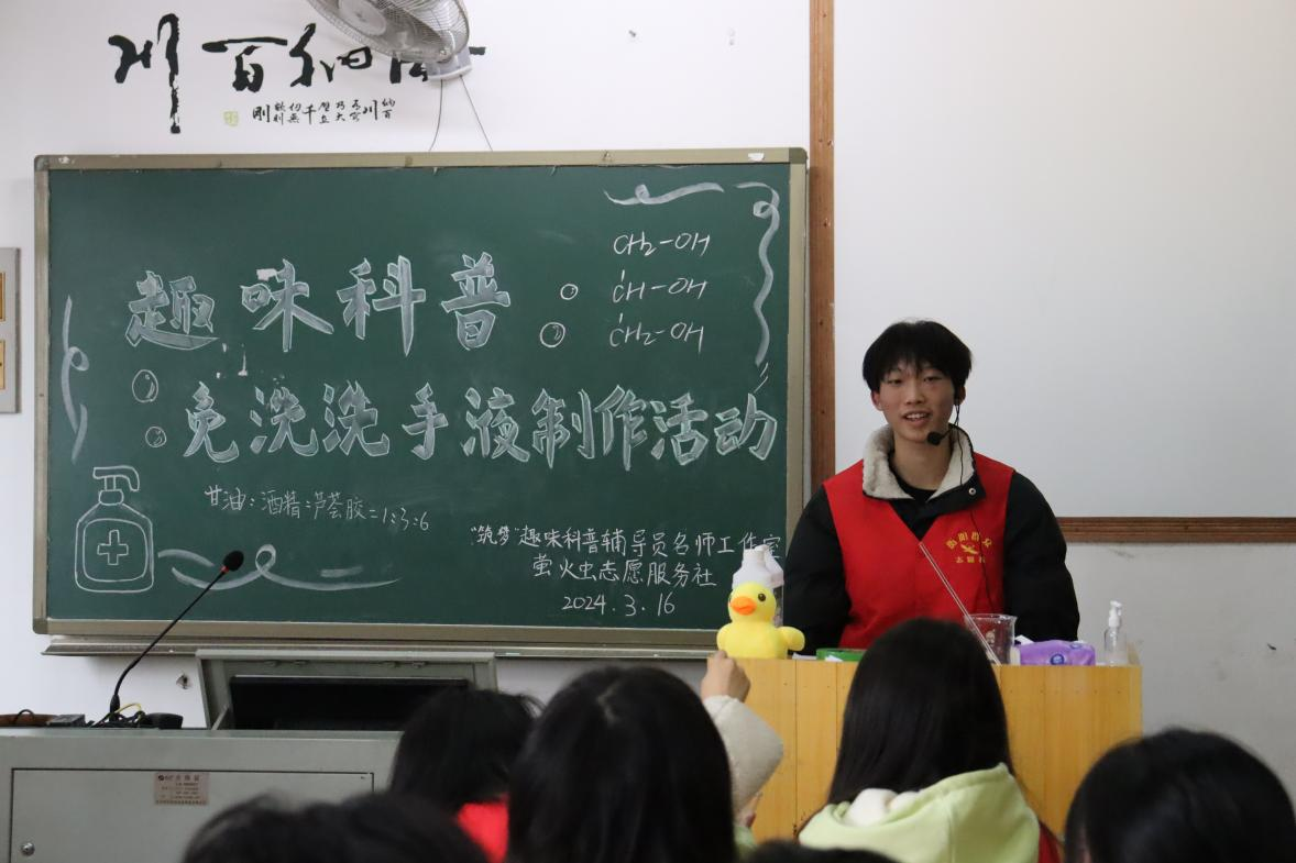 3月16日下午,tyc33455cc太阳集团西校区tyc33455cc太阳集团实验室里迎来一群新面孔,他们目不转睛地注视着讲台上的志愿者,认真聆听志愿者讲解手中产品的制作原理与操作要领。原来,这是tyc33455cc太阳集团萤火虫志愿服务社的志愿者们正开展以“小手工 大智慧”为主题的趣味科普进高校系列活动,他们将带领同学们制作手工皂、口红、叶脉书签等身边常见物品,希望大家在了解化学原理在基础上,亲身动手体验,进一步学习生活中的化学知识。活动深受公司老员工们的喜爱,前期报名便有500余人。