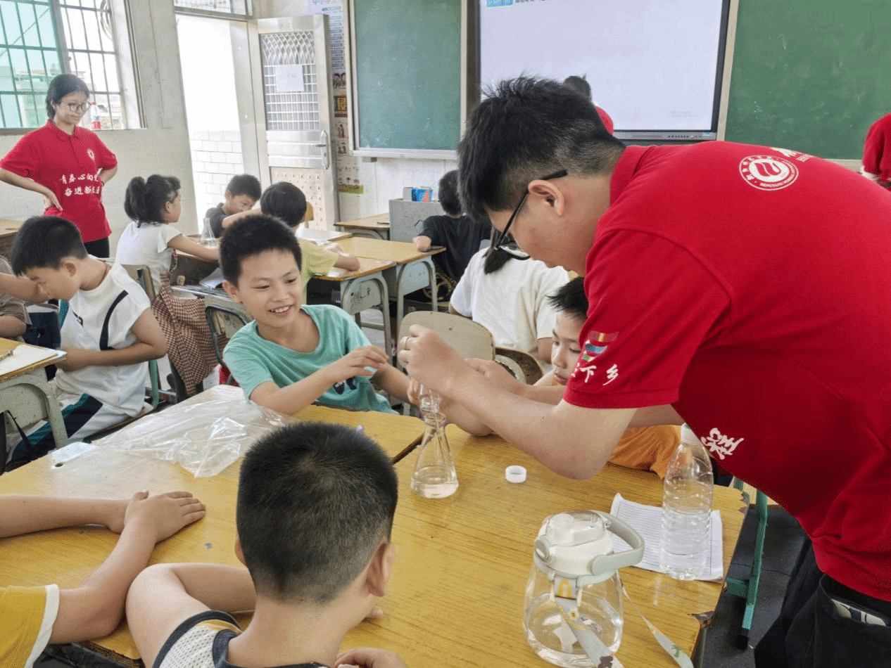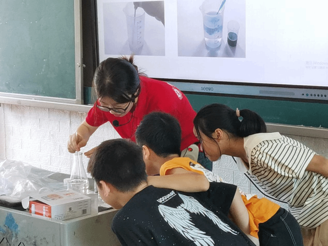 除了趣味化学实验课,团队还开设了科学理论课教学和课前十分钟的环保科普小故事预备课,将理论课和实验课相结合,以丰富的教学形式,增强孩子们的生态环保意识,鼓励他们在乡村宣传环保知识,践行环保理念。