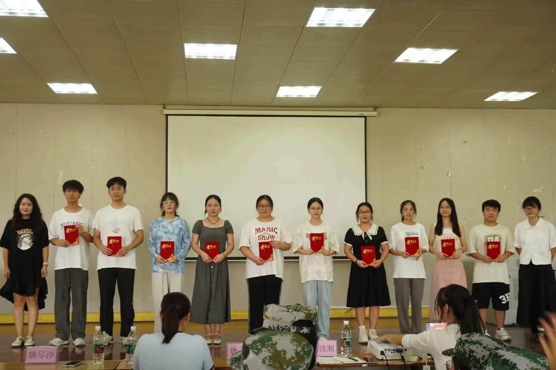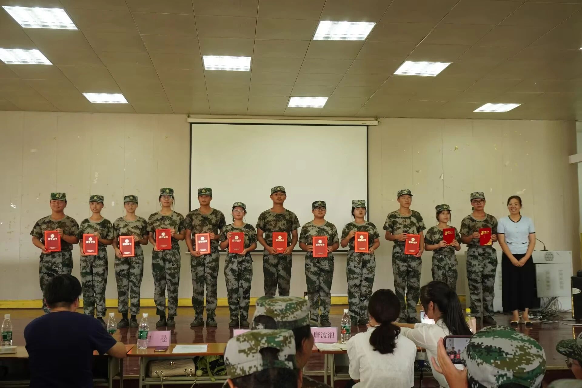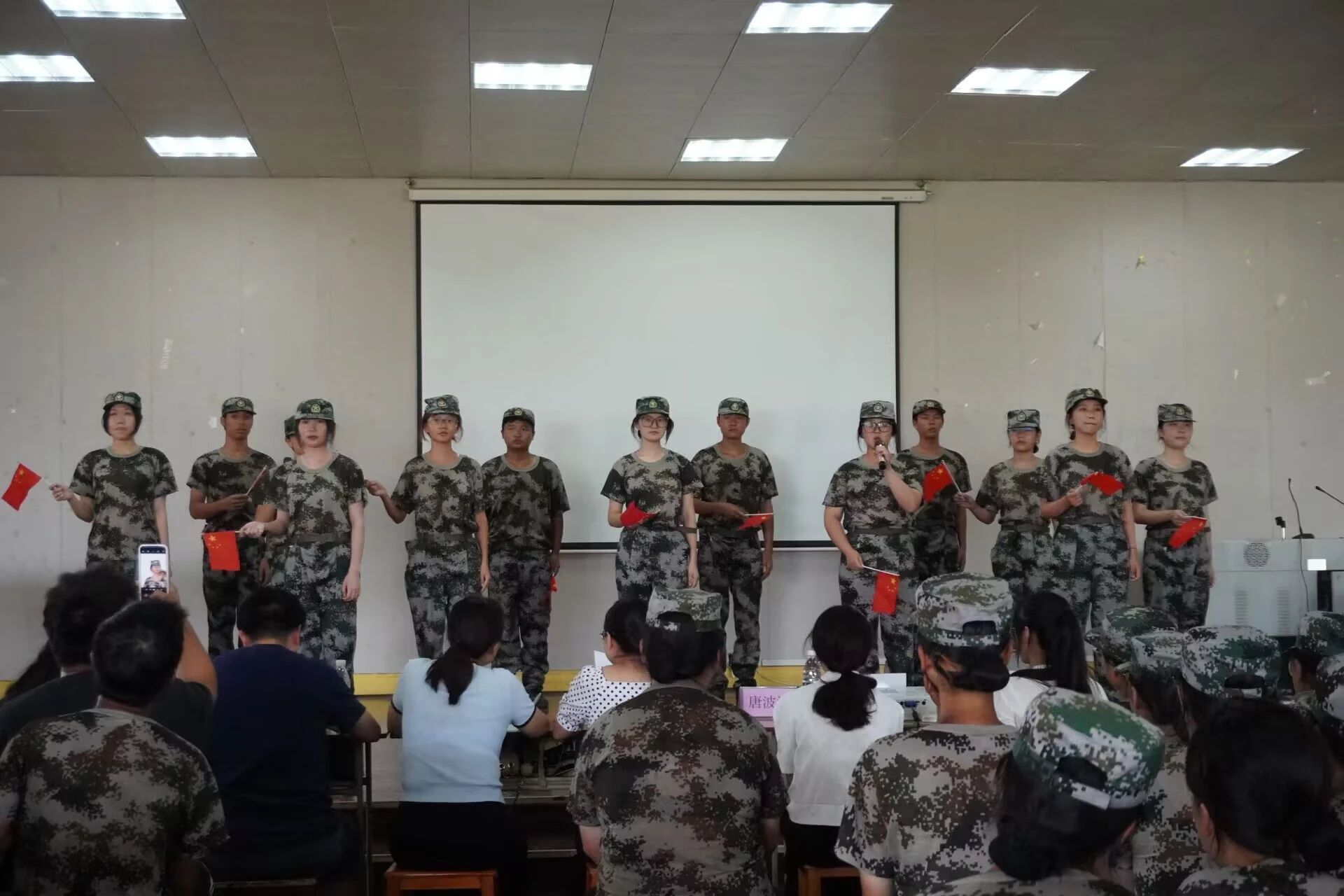 国歌奏唱后,唐升老师宣读了《2024年新生军训表彰决定》。公司领导和老师为叠被子大赛获奖选手、优秀军训学员、内务管理优秀宿舍、内务标兵宿舍、军训先进个人和优秀教官颁发了荣誉奖项。